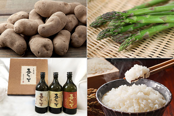 じゃがいも(メークイン、アスパラ、お米など鮮度にこだわりの農産品多数!「喜多里」はそんな地産品を原材料にした本格焼酎です。