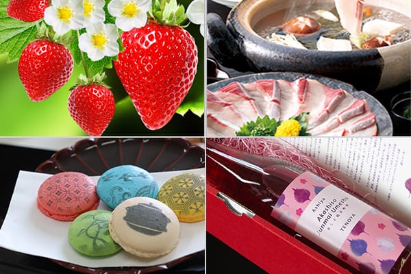 みんな大好きあまおう、苺大福やアイスなどのスイーツも充実のラインアップ!ふぐ刺し、ブリしゃぶで海の幸を味わいつくそう